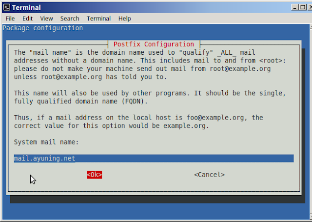 - kemudian kita disuruh untuk mengisi domain name yang akan kita gunakan untuk akses mail server nanti disini saya isi dengan mail.ayuning.net,kemudian tab lalu ok